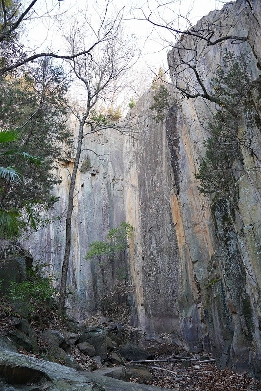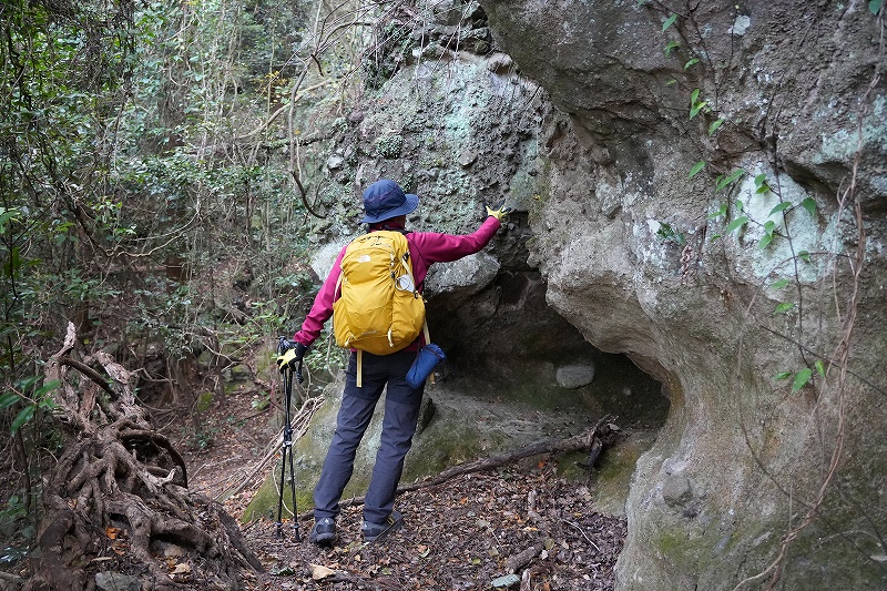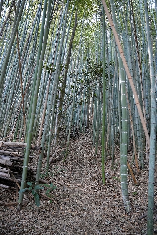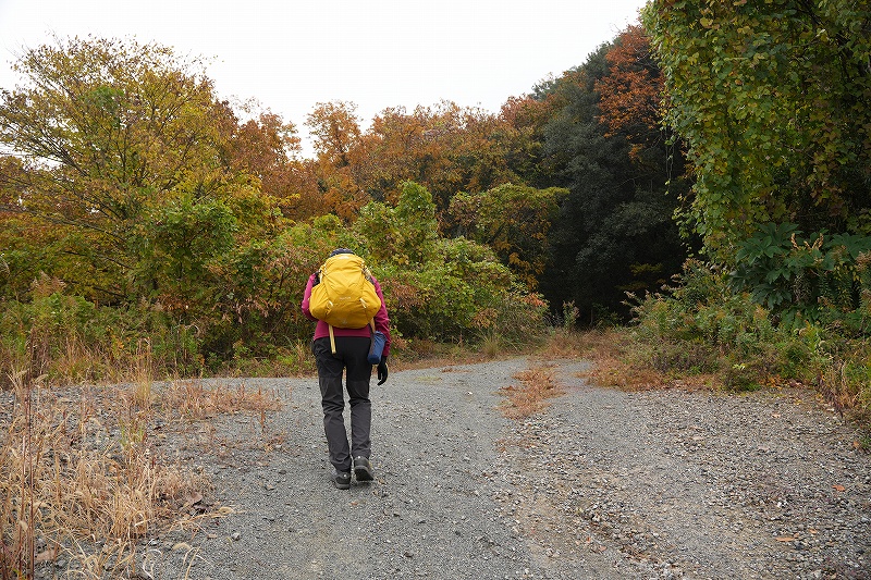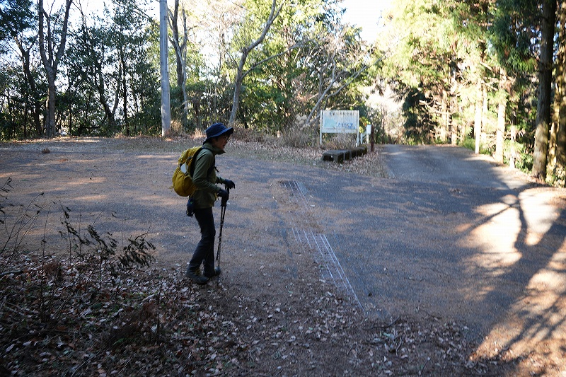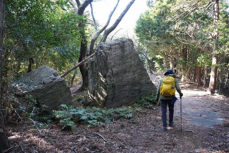 その先では露岩が現れ急登を登って行くと幅の広い道に出た。ここでは左に折れて杉林の中の道を歩いて行く。道の路面は地道ではなく舗装がされている。周りの雰囲気から林道でもなく作業道の様な感じもしない。