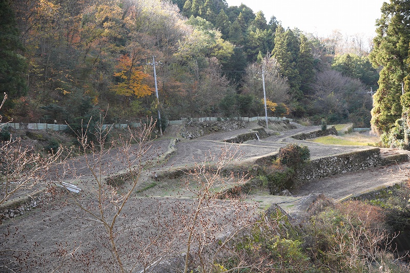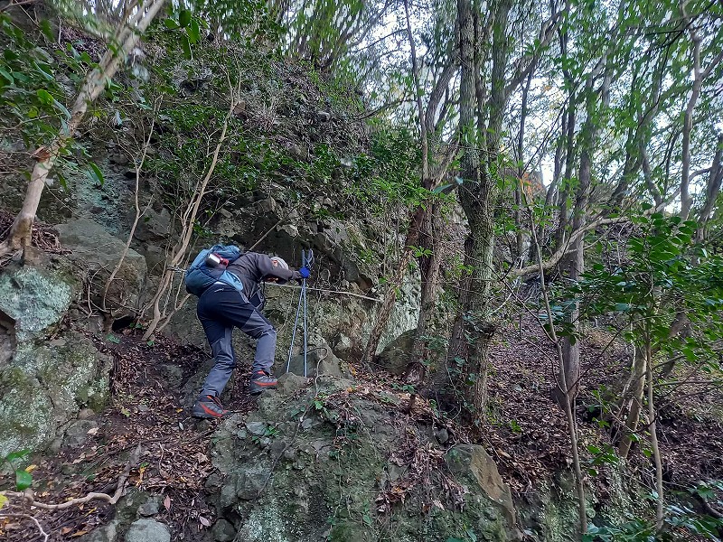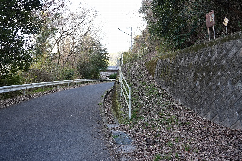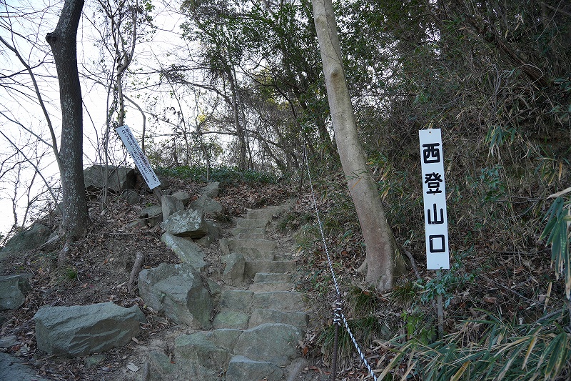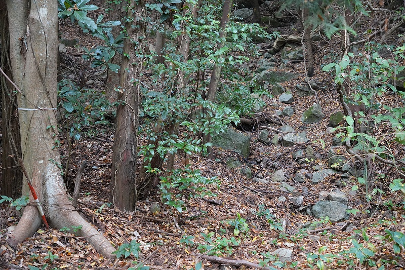 駐車場の手前の道の脇に登山口。いきなりの急登を登って行くと畑地の跡だろうか道の脇には石積みが残っていた。