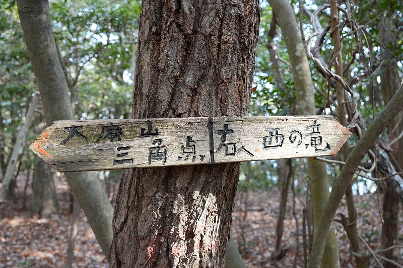 途中にあった道標は、初めて来て土地勘が無ければ少々分かりづらい。帰ってから地形図を見てみるとどうやら平石山から朝立神社への道が続いているのが分った。