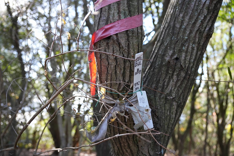図根三角点からは尾根沿いに地籍調査の杭と目印のテープが続いていく。先ほどの図根三角点やこの杭を見ると、つい最近地籍調査が行われているようだった。