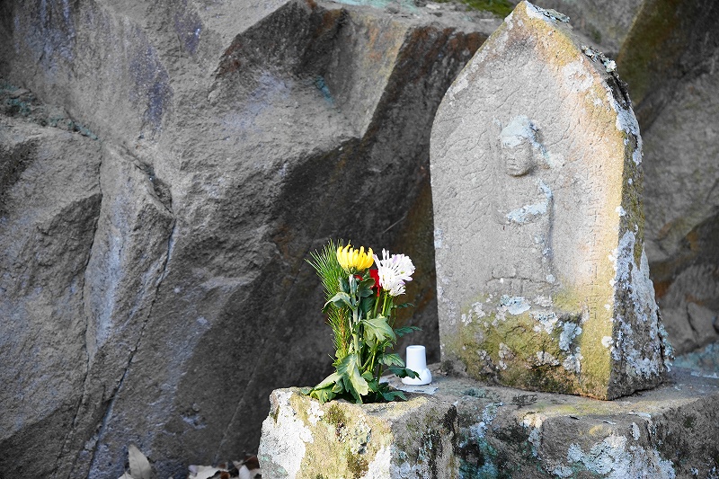 二つの大岩の横を抜けると三体のお地蔵さんが並んでいた。その内の一番手前のお地蔵さんは首から上が不自然なので、よ~く見てみると首の付け根に黒いボンドらしいものが付いていた。首から先が落ちてしまったのを誰かが修復したのだろうか?