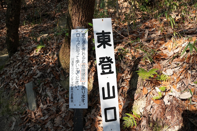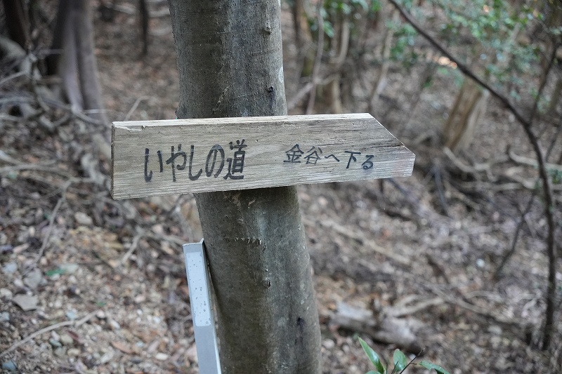 しばらくは整備された四国のみちを下って行く。途中にある前回登ってきた五滝への分岐の道標も、手作りで小さく可愛らしい。この山はどこかの山のように仰々しい道標や、山頂での山名を描いた派手な写真を置いている訳でなく、遠慮気味に作られているのがいい感じだ。
