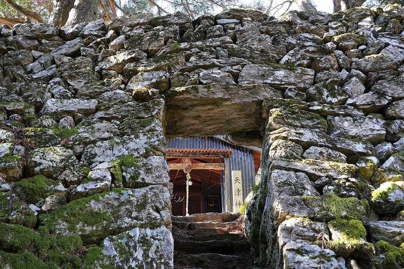 すると見覚えのある石垣が現れた。石垣の奥には天津神社の拝殿が見える。お腹を減らした奥様には待ってもらったが、これでやっとお昼ご飯にできる。