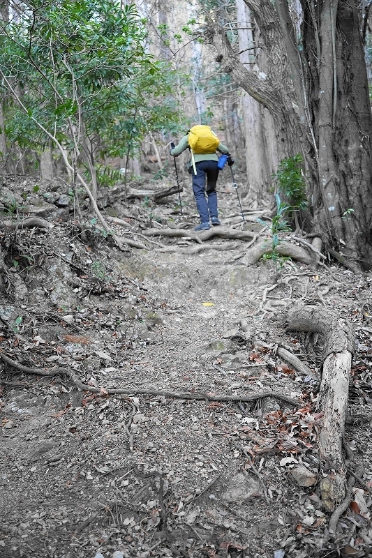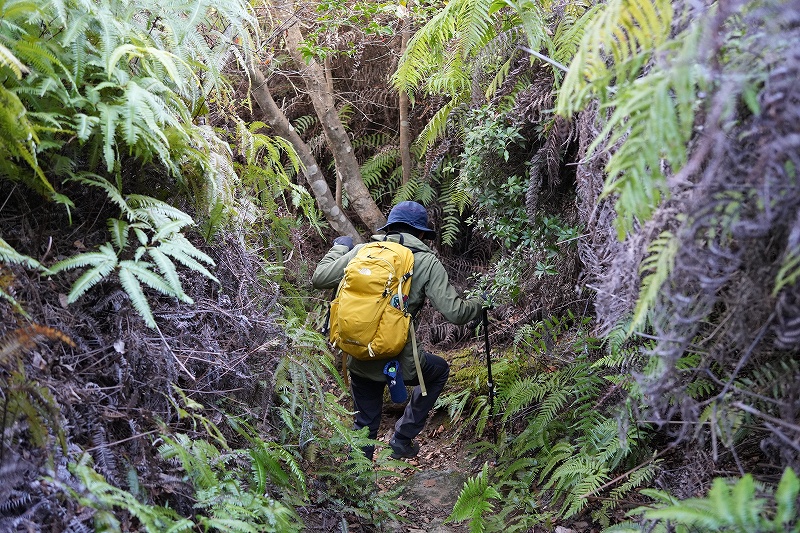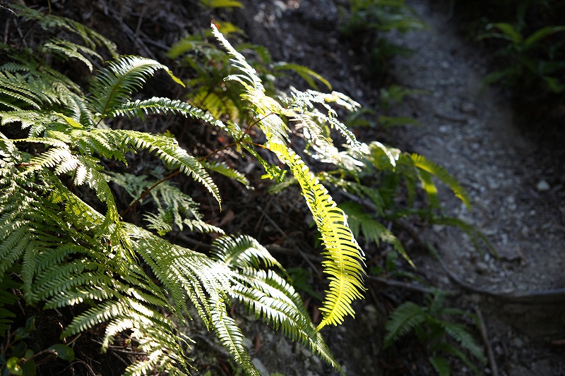道は松葉の道からシダの道に変わる。北から続く尾根道は日陰で、時折日差しが差し込むがまだまだ肌寒い。