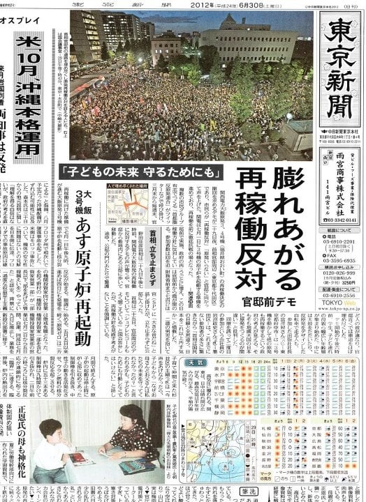 2012-06-30 マスコミ 雑記 今朝の東京新聞です。 一面に大きく書かれた昨晩の抗議デモ。 数万人規模のデモでも、他の新聞では取り扱いがマチマチです。 四国新聞はまだまし、朝日新聞の一面などは・・・・・?読売は? 日本のマスメディアはどうなってるんでしょう!