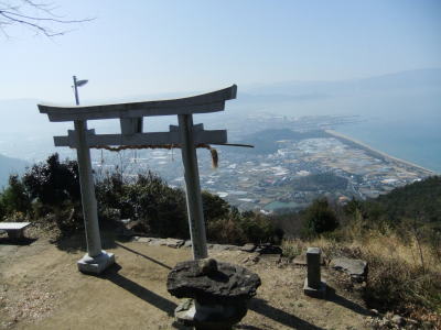 その石段を登りきり振り返ると、有明浜と燧灘、そして遠くに法皇山系が霞みの上に浮かんで見えました。