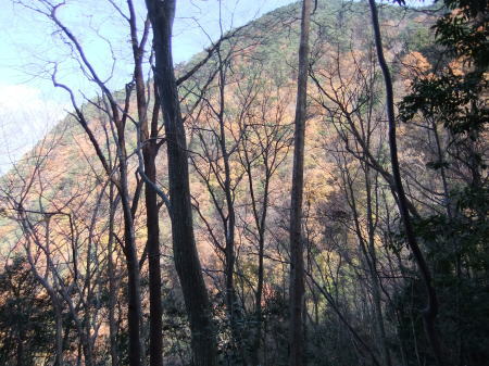 尾根からトラバース道にかかると向かい側の山頂下の綺麗に色づいた斜面が目に入ります。