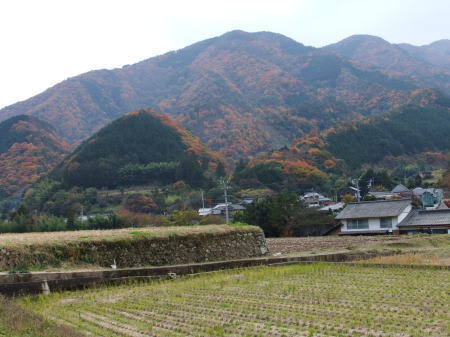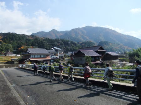 麓に着いて、四方の山々の色づいた秋の景色を眺めながら公民館までの道を歩いて行きました。