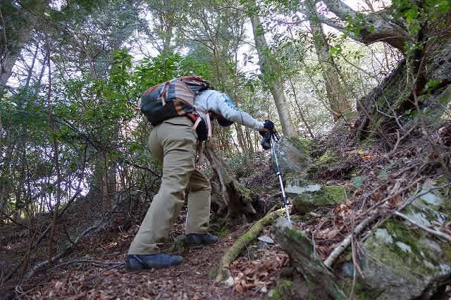 道は険しく、赤テープに頼った登りになりますが、所々にエントツ山さんの仕事の跡の