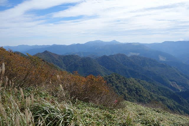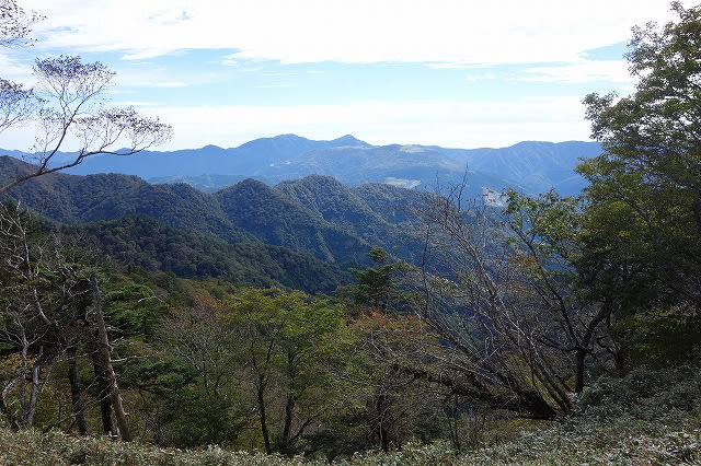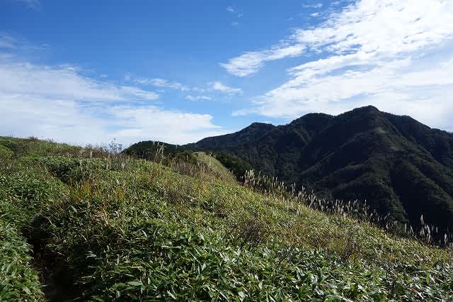 腰より高い笹に覆われた道を登って行くと、後ろに峠から落禿への景色が広がってきます。