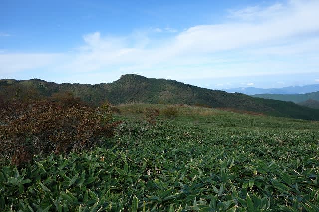 ひと登りすると肩の広い笹原が広がり、北西には烏帽子山が名前の通りの形を見せてくれます。