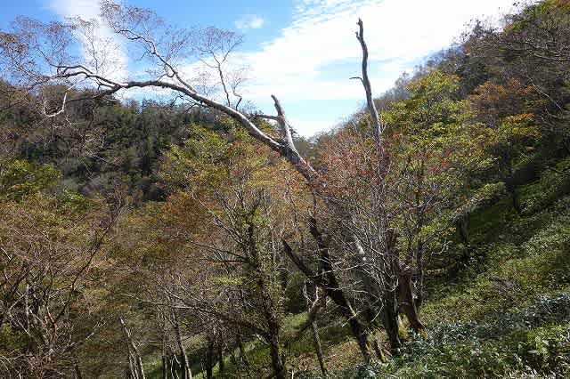 分岐からはトラバース道。笹の茎の残る歩きにくい道に、滑らないように注意をしながら進みます。
