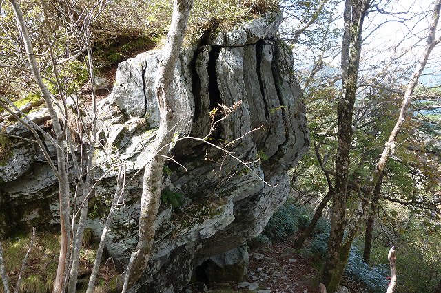 ここからは所々に大きな岩が現れ、道迷いの注意を促す赤テープが目に付くようになります。