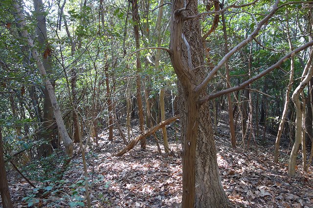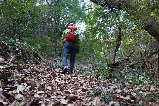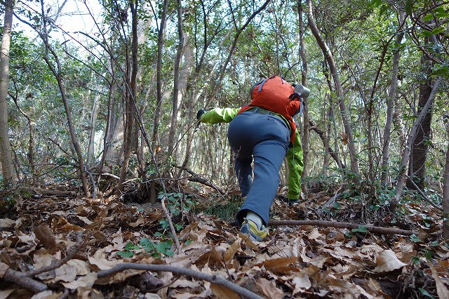そこから尾根に上がり急坂を上って行きます。深く積もった落ち葉と柔らかい斜面に