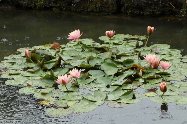 芝生広場から「枕流亭」を通り、「石梁」の手前にはスイレンが花を咲かせていました。