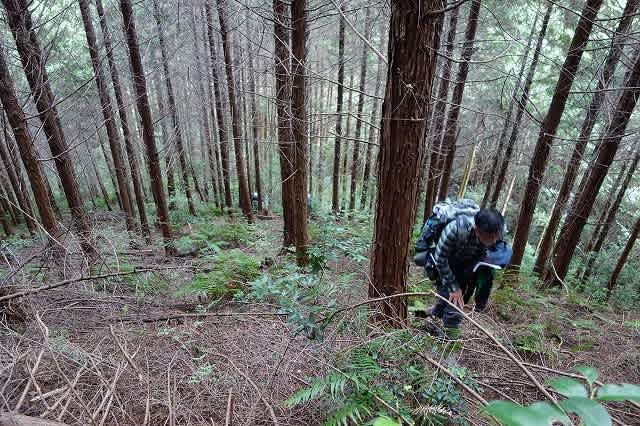 たしかにテープがあったのですが、踏み跡もほとんどなく杉林の中を登って行きます。