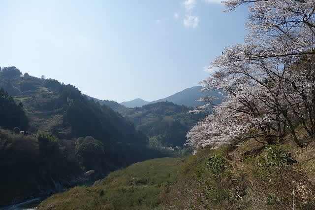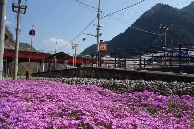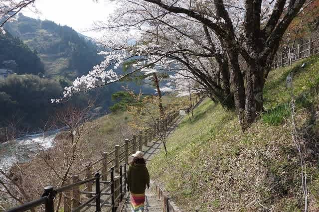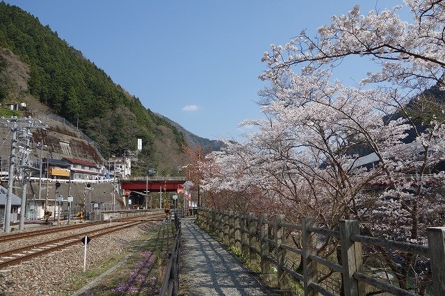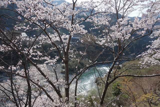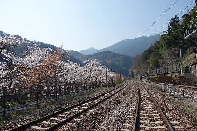 プラットホームの奥にあり、澄み切った吉野川の水の流れを眺め、ほぼ満開に近い桜の花を
