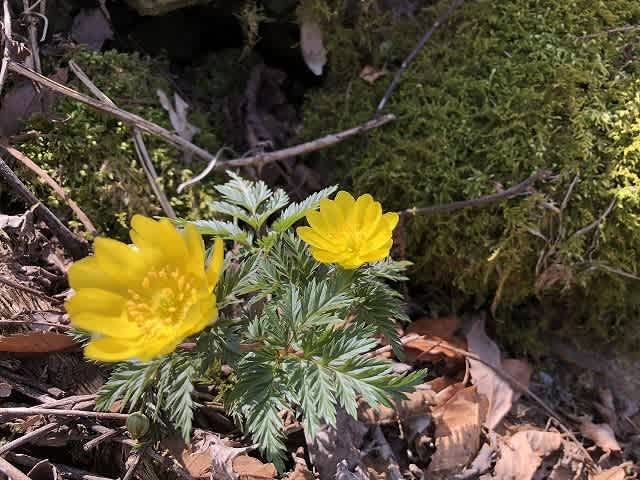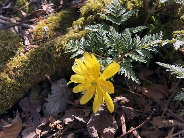 少し登って行くと左側に、苔むした岩の間にまた黄色く咲く『福寿草』。