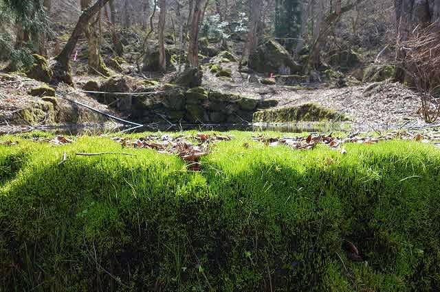 この苔庭から尾根はすぐ目の前です。所々散りばっている小さな福寿草の葉を踏まないようにして