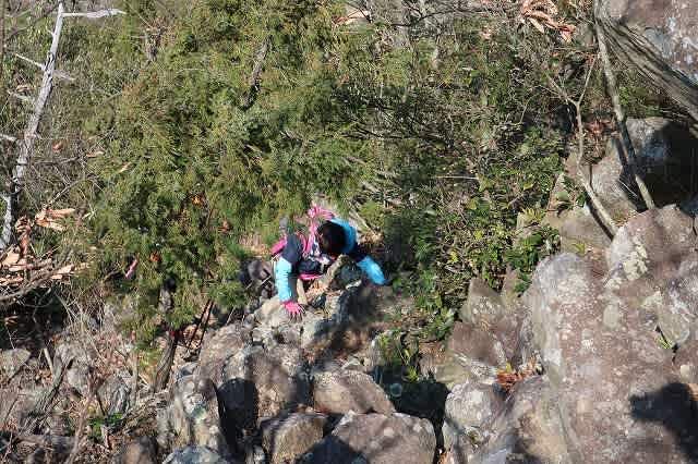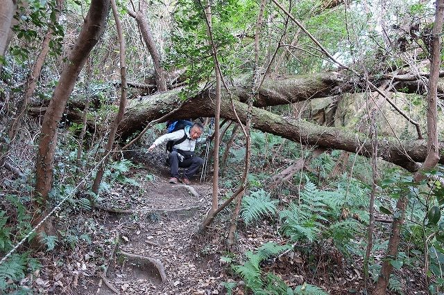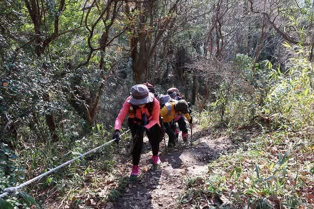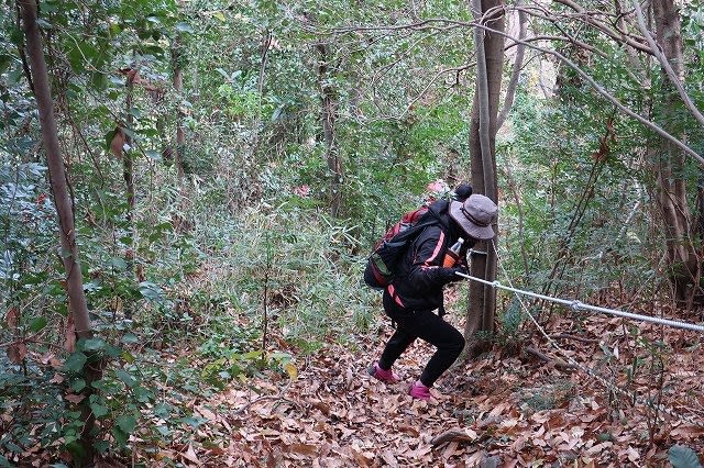 この伽藍山からの下りも相当な傾斜です。急な箇所には太いロープが張られていますが、