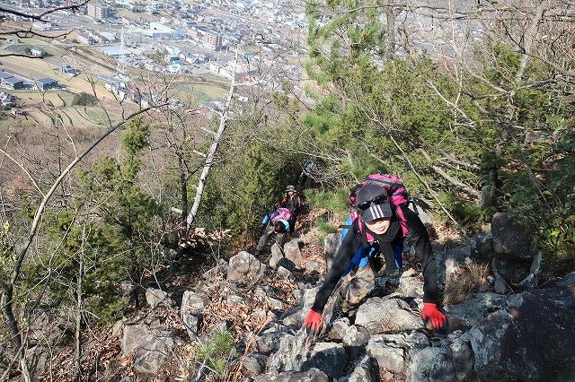 吹き上げてくる風に負けないように岩肌を登ります。身軽な先輩はヒョイヒョイと登ってきます。