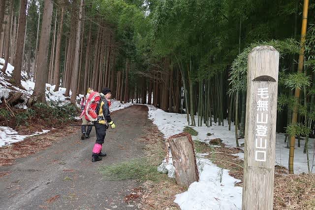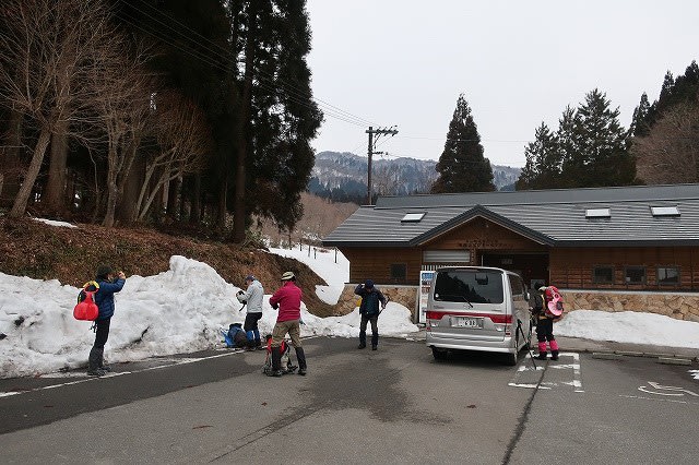 次第に焦りが出てきましたが。登山口の『毛無山山の家』の駐車場には雪が残っていてほっと一息。