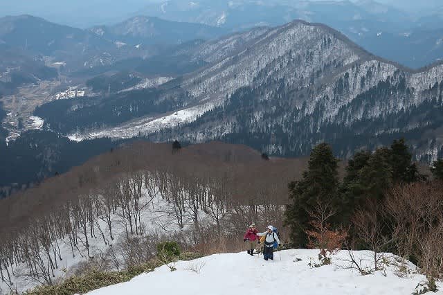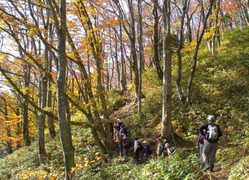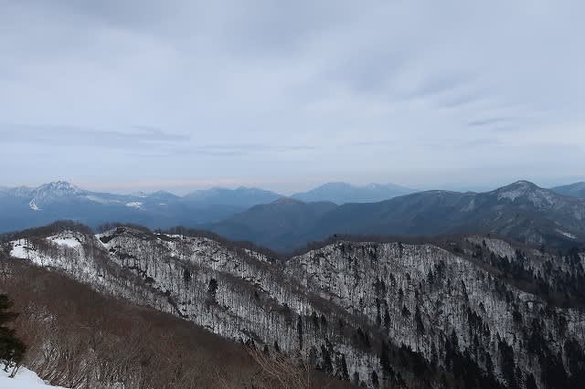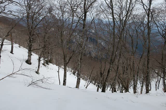 薄暗い杉林からすっかり葉の落ちたブナの林になると周りも急に明るくなり、振り返ると遠景や