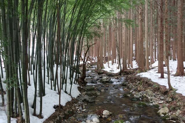 道の脇には雪解けのいかにも冷たそうな水が流れる沢が並行して続いています。