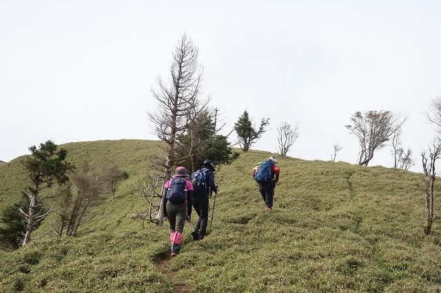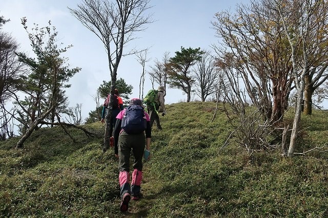 自然林の尾根が終わると足元は背の低い笹に変わります。ここからは笹の間の踏み跡もしっかりしていて