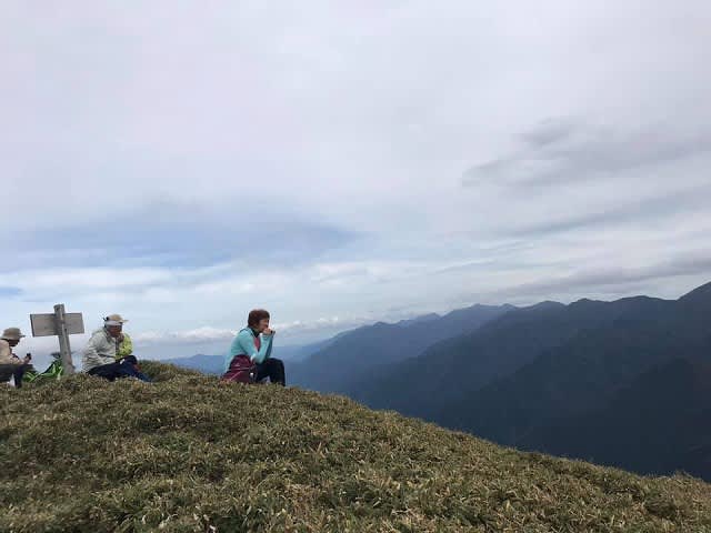 山頂手前の三角点からは見晴らしのいい笹原の小道を歩くと、直ぐに山頂へ到着しました。