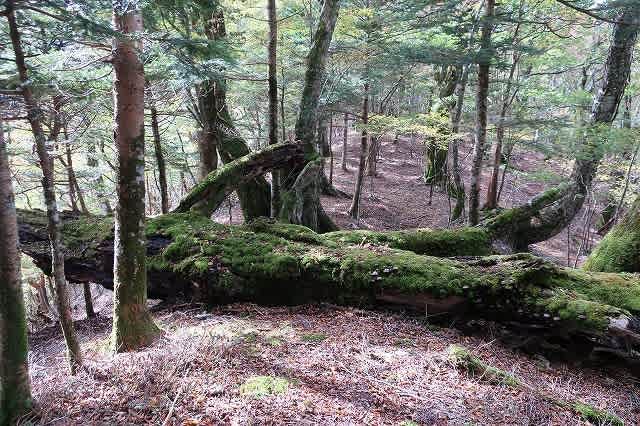 ここからは一旦下りさらに登り返すとブナやヒメシャラの大木が続く尾根道を歩いて行きます。