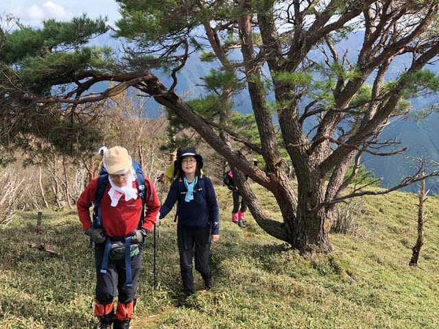 山頂での楽しい時間を終えて下って行きます。笹原小道を身軽なやまじいとあっちゃんが