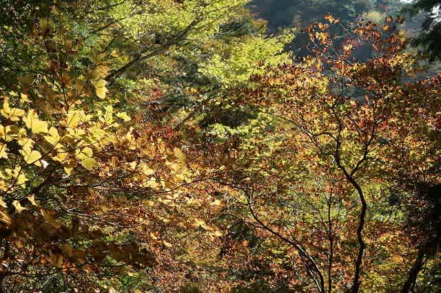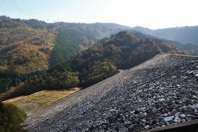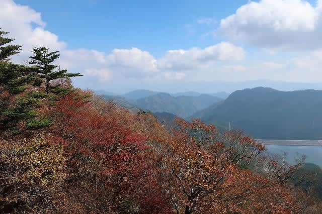途中の林道から見えた周りの山肌は結構色づいていたのにダムの管理事務所の奥に見える山頂の色付きはあまりなく、