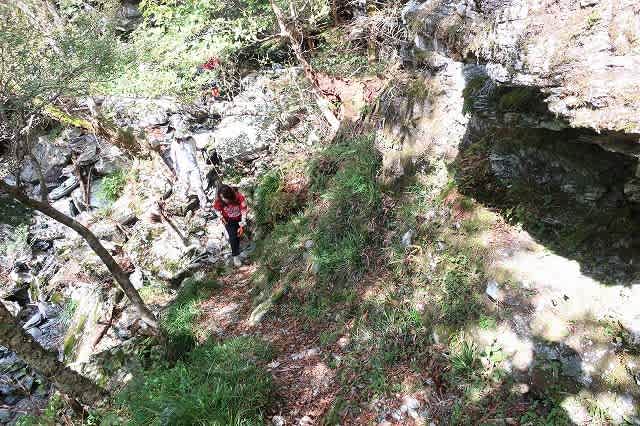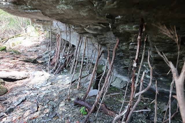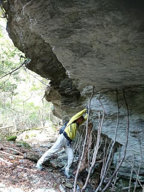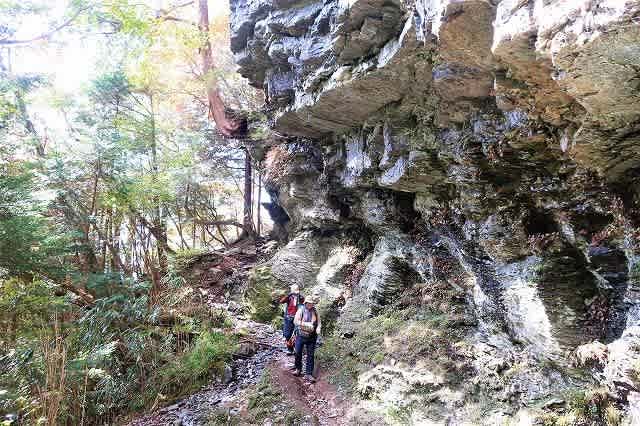 沢に沿った道が沢を高巻くようになってくると大きな岩壁が現れます。途中で岩壁の足元がえぐられたようになった所では
