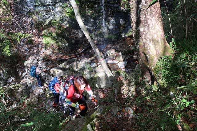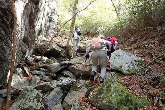 渡渉して岩場の足元を登ると支尾根に向かって急登が始まります。