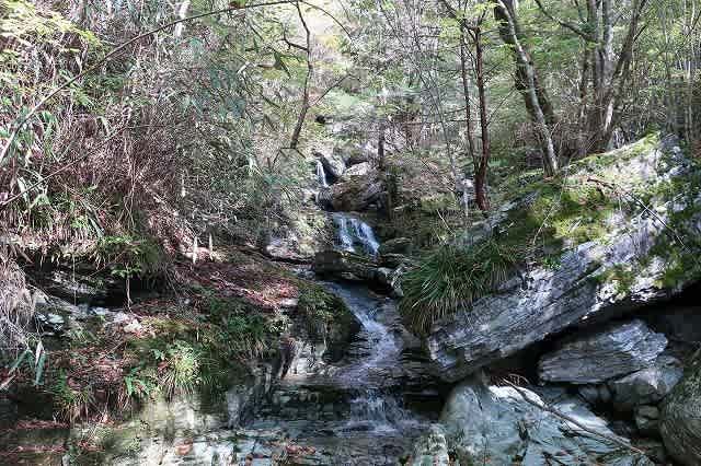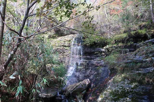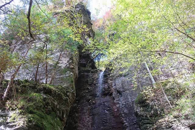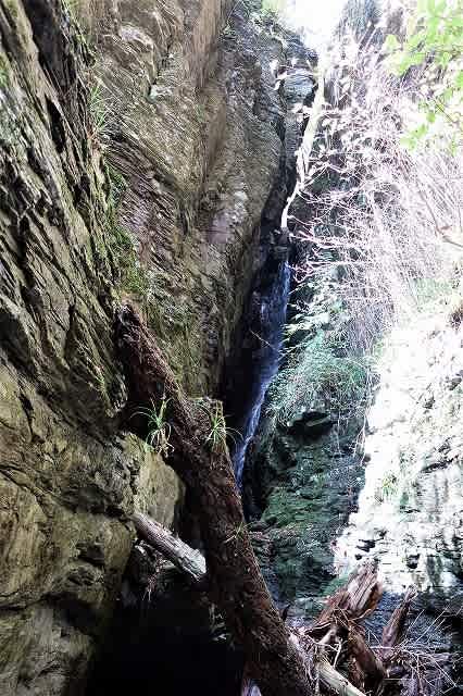 最後の渡渉ヶ所の上部に狭い岩と岩の間に流れ落ちる滝があります。