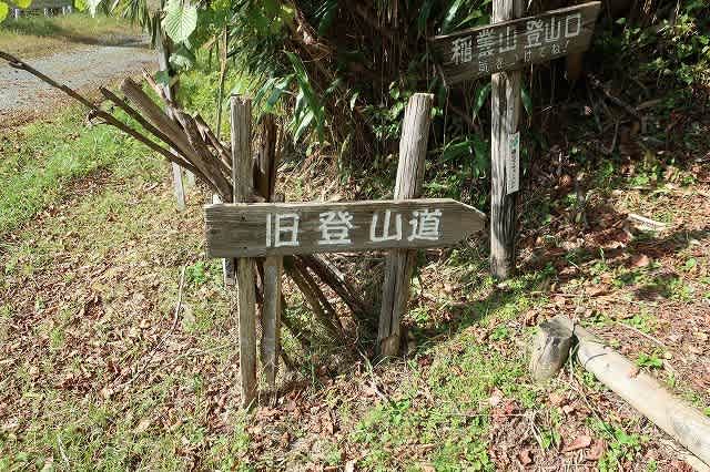 トンネルコースと鉄塔コースの分岐の四差路でもう一度休憩します。『稲叢山頂』と書かれた分岐道標を見て