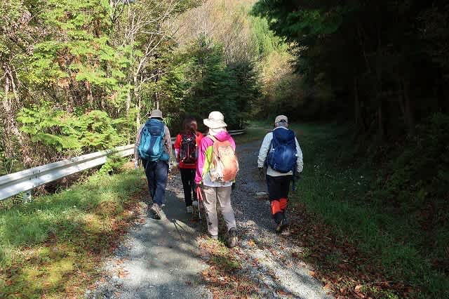 駐車場でザックを降ろして寛いだところで、『やまじいさん、滝へは少し道から下るので、靴はそのままで!』と言うと