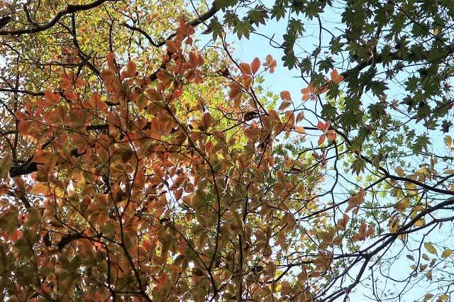 この辺りから道の脇の木々の彩が目につき始めます。支尾根に出て平らな場所で一息入れます。