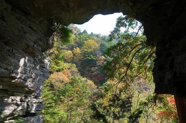暗い洞窟の中から振り返ると明るく輝く木々の彩。