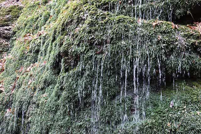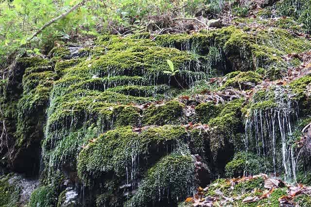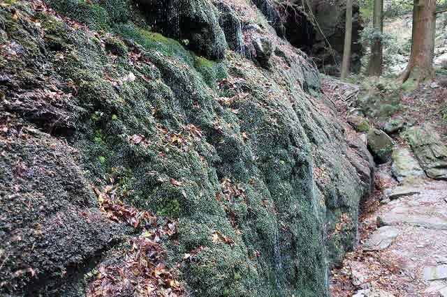 紅葉滝から急登を登り少し下ると広場になった横に、一面苔むした大きな岩から雫が落ちる『玉簾』。