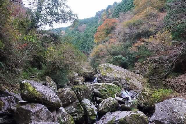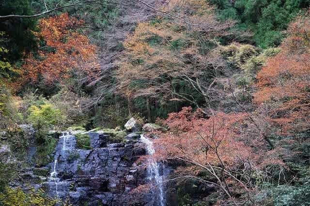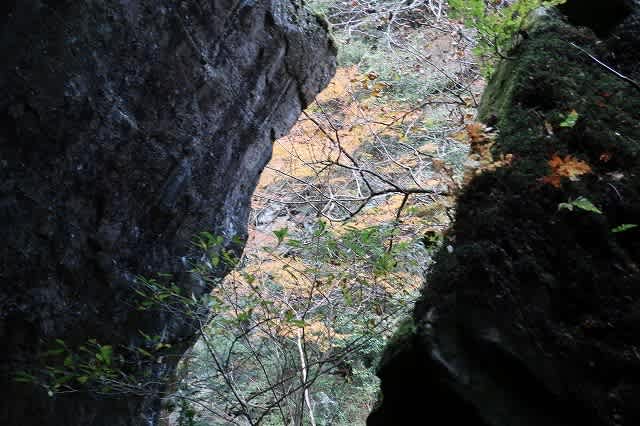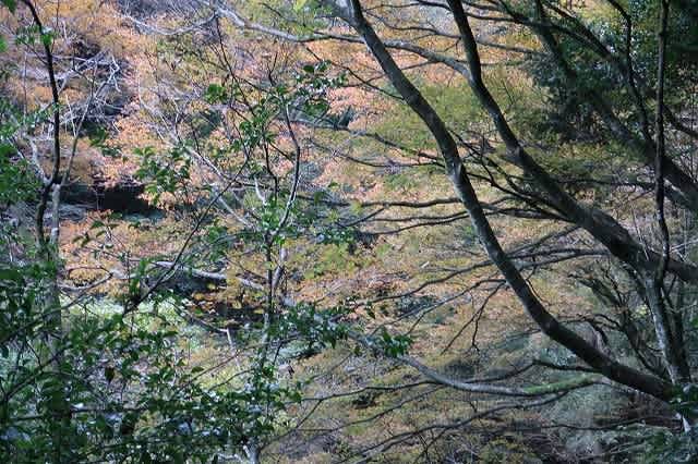 渓谷の奥に色づいた木々が見えますが、曇り空の下では日が当たらずせっかくの彩も今一つです。
