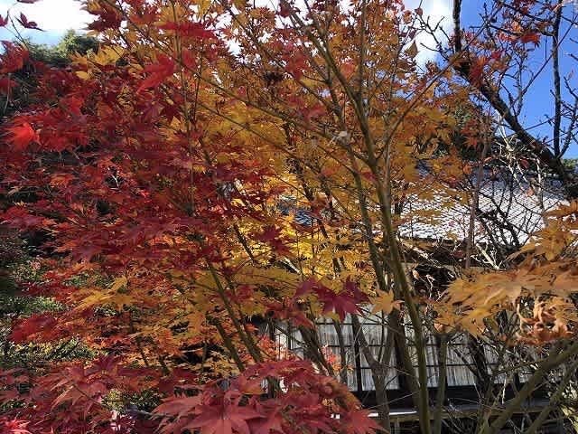 三角寺の境内には青空の下今日一番のモミジの彩!
