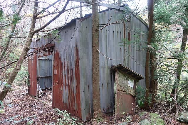橋を渡りしばらく歩くと造林所の朽ちたプレハブ小屋。この辺りになると木々の葉も散り始めていて