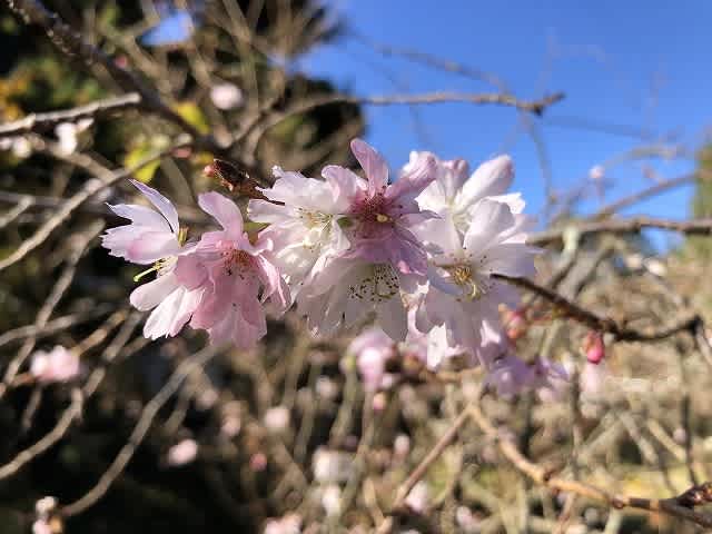 真っ赤に色付いたモミジの横で、散りかけた十月桜が最後に花を添えてくれました。