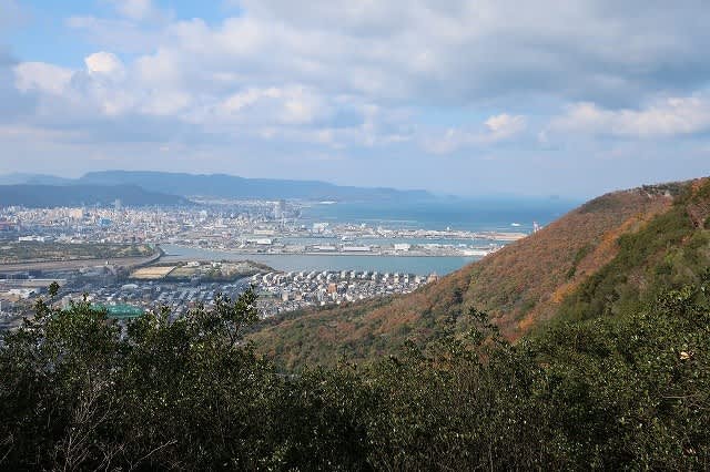 岩の上からは西尾根のきれいな紅葉した木々の山肌と高松の港湾。