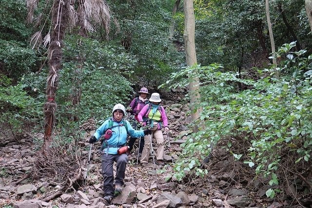 木々に掴まりながら息を切らせ、汗を拭きふき登って行きます。エントツ山さんは初めて歩く道。