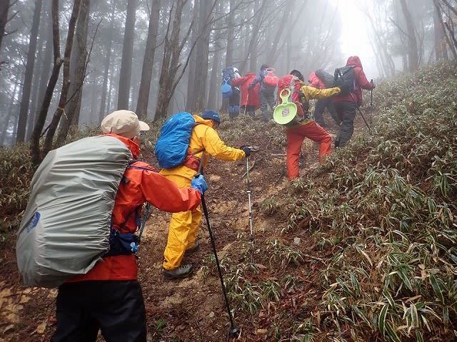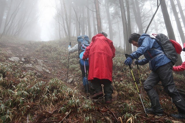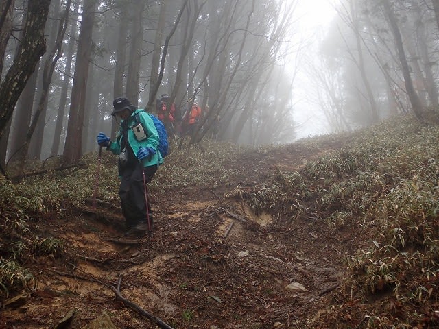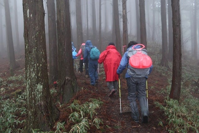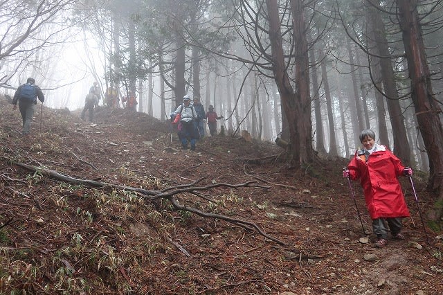杉林を過ぎると九十九折れの急登が始まります。静かな森の中に女性陣の賑やかな話声が響きます。