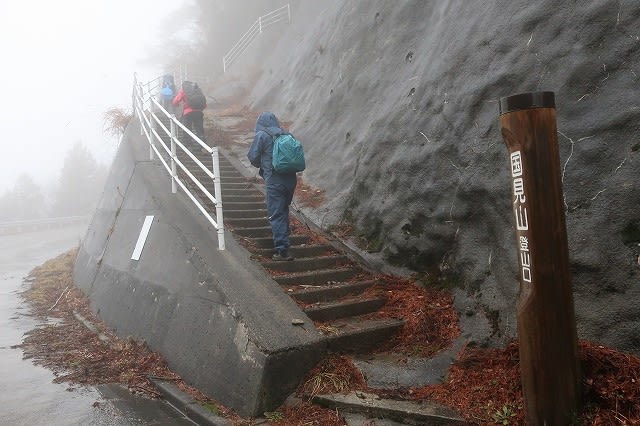 登山口の階段を登り樹林帯の中に。日差しもなく薄暗い道を進んで行きます。