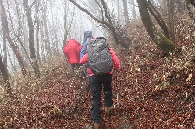 ぬかるんだ場所では登山道を避け、脇の笹を選んで下って行きます。